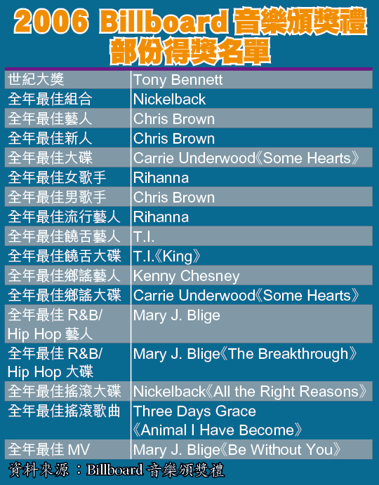 由美國流行榜權威雜誌《Billboard》舉辦的音樂頒獎典禮BillboardAwards,昨日於賭城拉斯維加斯舉行,R&B天后MaryJ.Blige總共捧走9個獎項,而Rihanna及ChrisBrown兩位黑人新秀則分別獲得全年最佳女歌手及最佳男歌手,賽果反映了今日美國流行音樂盡是HipHop及R&B的天下(賽果詳見附表)。