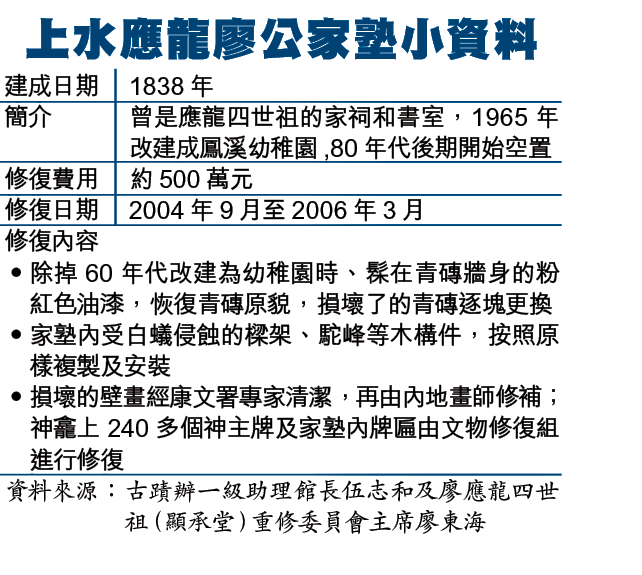 【本報訊】有168年歷史的上水應龍廖公家塾日久失修,再加上60年代被改建成幼稚園後,原貌大受破壞,廖氏族人自資500萬元進行修復,又發動村民四處收集舊青磚,以更換已損毀磚瓦。結果令祠堂恢復清代建築風格及布局,最近更獲聯合國教科文組織頒發文物古迹保護嘉許獎。 記者:盧文烈