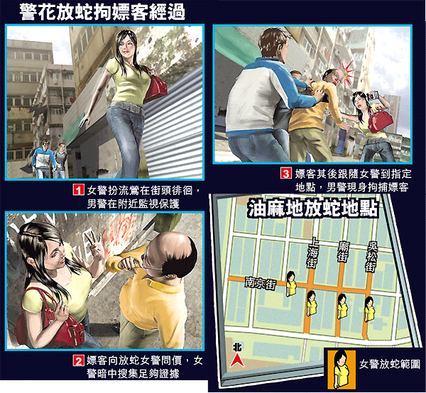 前日下午4時至昨日凌晨1時許,油尖警區特別職務派出7名女警假扮「企街」流鶯,在廟街、上海街、南京街及吳松街等流鶯出沒黑點徘徊,每名警花都有兩至三名男警離遠監視保護,遇上有「好色之徒」趨前問價:「200蚊,得唔得?」警花會搜集證據,待時機成熟即會向男警打出暗號,然後表露身份將嫖客拘捕。
