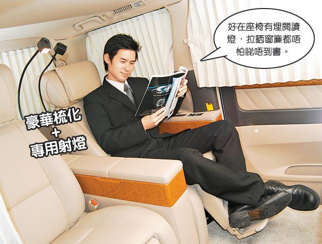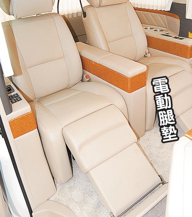 能夠讓乘客時時刻刻可以享受到至頂級的「飛行」旅程,AlphardExpress視之為己任,故在新購入的ToyotaAlphardRoyalLounge「廣體客機」內,放棄了原來的中後兩排商務艙座位,取而代之是只可接載兩名乘客的頭等艙。艙內左右兩張獨立座椅可按閣下需要,按下設於旁邊的控制鍵來調節角度及高低,以調節至適合自己的坐姿,同時更可把附設的腿墊伸開,從而令閣下可享受到最舒適的「飛行」感受。