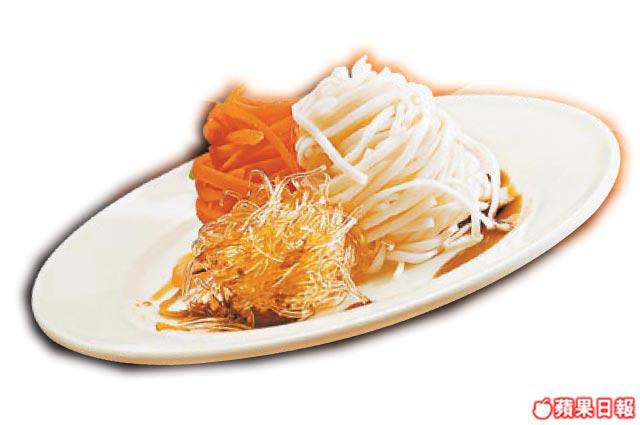 日式冷麵做法,以幼滑的烏龍麵,拌素翅及僅軟身的甘笋絲同食;葵花籽醬油汁,亦好帶出冷麵的鮮味。