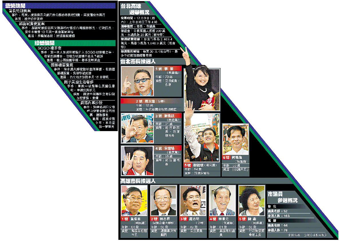 台北、高雄市長的選舉將在周六舉行,雖然今次只是台灣兩大都會的選舉,但在藍綠色彩分明、醜聞滿天飛之際,選舉被外界視為對總統陳水扁和台北市長馬英九的信任投票。其實,不論結果如何,陳水扁早已成跛腳鴨,受傷最重的反而是馬英九。由於危機處理不當,未能有效抵擋明槍暗箭,令人擔心馬英九是否「只是一個長得好看的哈佛高材生而已」,他競選總統之路將變得更崎嶇。
