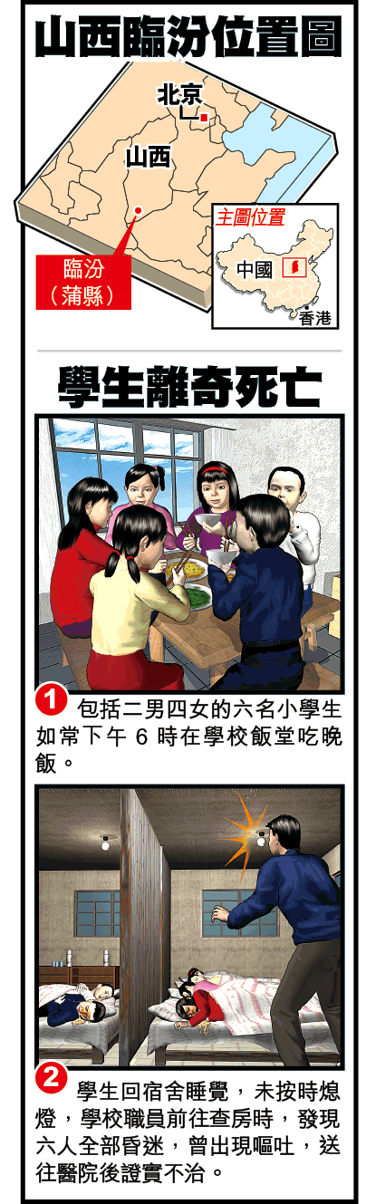 山西省臨汾市蒲縣一間小學的6名在校寄宿生,周一晚(12月4日)突然離奇死亡。死者二男四女,年齡由6至10歲不等,各人被發現時昏迷在宿舍內,口有嘔吐物,送院時瞳孔放大,手腳冰冷,經醫生證實全部不治。據稱,當地警方事後扣留學校廚師和老師等多人調查,當局經化驗初步排除食物中毒,但未能確定是否有人落毒。