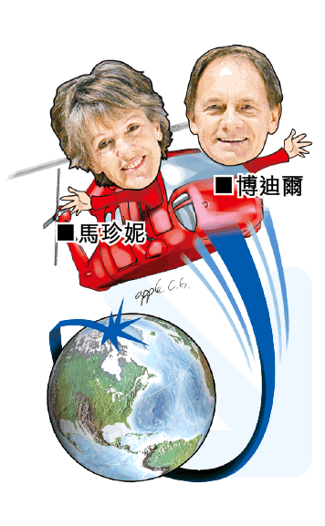 探險家馬珍妮(JenniferMurray,即係前和黃大班馬世民太太)同博廸爾(ColinBodill),三年前揸直升機環遊世界,差啲機毀人亡。佢哋死心不息,66歲嘅馬太同55歲嘅博廸爾,仍然希望率先完成揸直升機經南北兩極環遊世界一周嘅創舉,所以佢地前日已出發,計劃用169日飛越66,000公里路程。博廸爾仲話,上次衰咗,令佢哋更渴望成功。有吉士!咁就祝佢哋一路順風啦。