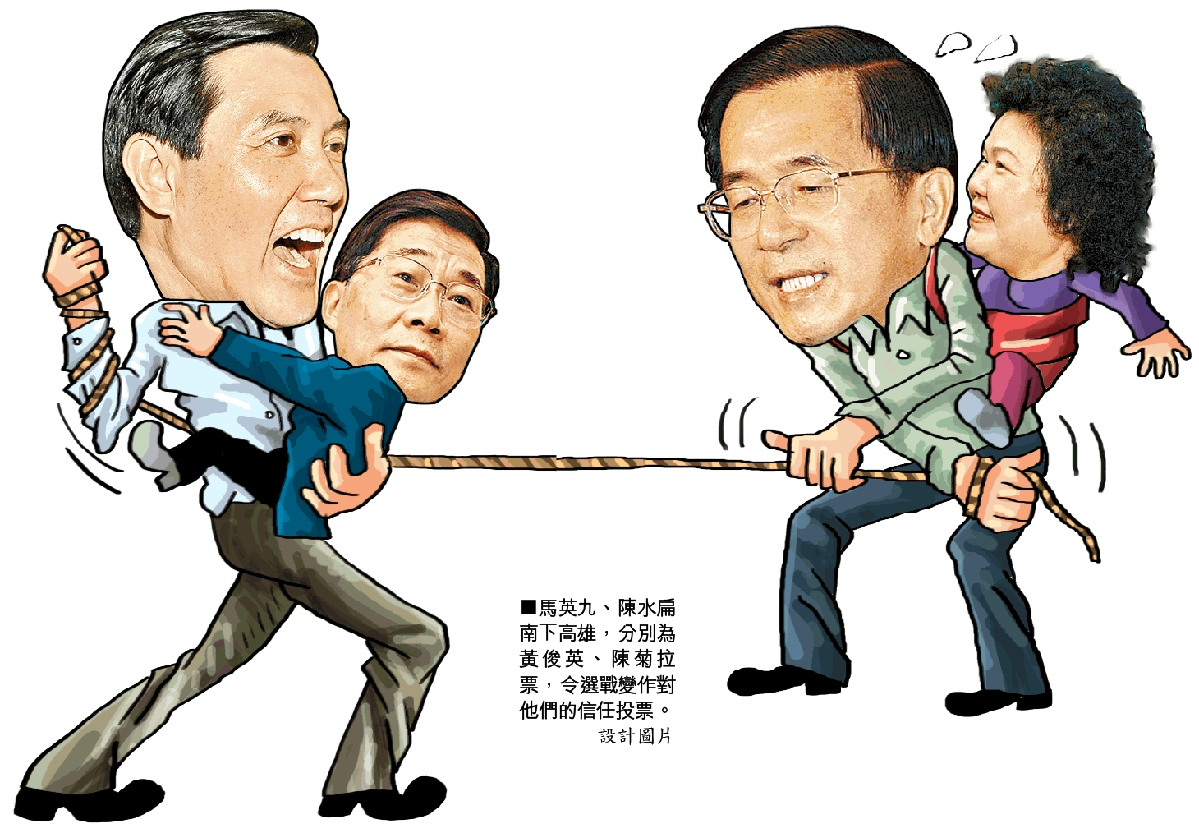 國民黨基本上是馬英九單天保至尊,榮譽主席連戰、立法院長王金平只在周日南下助選,而民進黨則是星光熠熠。除了陳水扁,還有副總統呂秀蓮、行政院長蘇貞昌、民進黨主席游錫堃,昨日都在高雄為陳菊奔波,成為傳媒追訪的焦點。