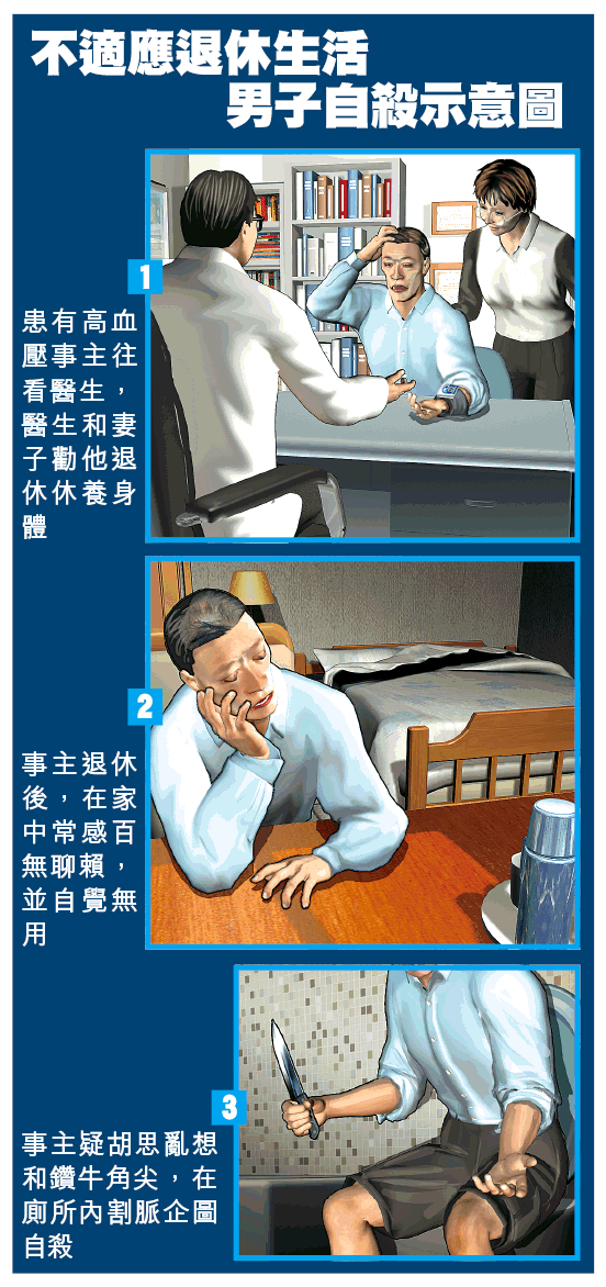 消息稱,事主退休後在家無所事事,顯得很不開心;這幾個月間,事主的體重由160磅暴跌至140磅,家人均十分擔心。昨晨11時半,事主進入廁所後十多分鐘仍未出來,其妻於是拍門查看;不久,事主開門,妻子見他雙手的手腕均在冒血,原來他於廁所內用刀在兩手割脈,於是立即報警將他送院治理,幸無性命危險。