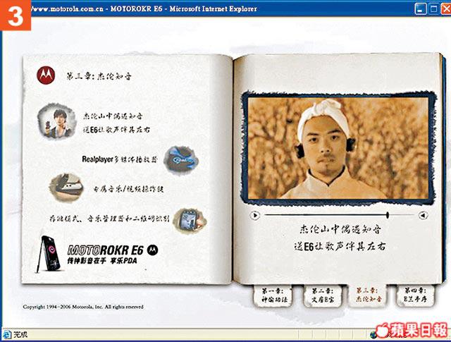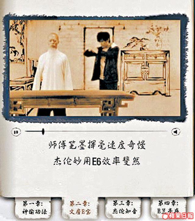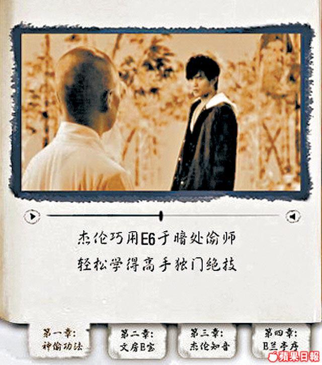 用得周董做代言人的E6,當然內內外外都找到他的影子,拉開包裝盒,就有Jay出現,Fans見到即叫!最重要是跟機送的1GB記憶卡,內容是阿Jay的《本草綱目》的MV和《我的地盤》鈴聲,仲有11款周董的Wallpaper。不過,最過癮還是阿Jay扮演武林高手,教你神功秘笈,仲分四個章節。背景是黑白的國語長片feel,講他爬上簷篷,用手機偷拍高手練武,身手敏捷,又用手機鏡頭支援電腦玩視像,仲教埋師傅拍片,其實都係想教大家手機各種功能。阿Jay自己都說:「宣傳應該幽默一點,現有很多小朋友都用手機,這個神功秘笈應該可以吸引他們。」雖然秘笈內功夫是有專人設計,但加埋Jay好似好認真,又好似好型的表情,幽默兼到point,好過睇說明書好多!最重要有阿Jay睇嘛!