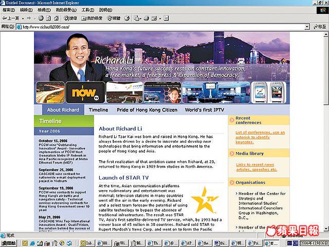 另外,李澤楷昨日向業界選民發出電郵,內裏除了上載了他的錄音,呼籲選民星期日投他一票外,電郵也有其個人競選網頁超連結,該網頁以《RichardLiHongKong'sfuturesuccessrestsonconstantinnovation,afreemarket,afreepress&expansionofdemocracy.》(李澤楷香港未來成功有賴於不斷創新、自由市場、新聞自由,以及擴大民主),不過競選網頁只提及他過去對業界的貢獻,未有觸及民主立場。(網址: http://www.richardli2006.com)