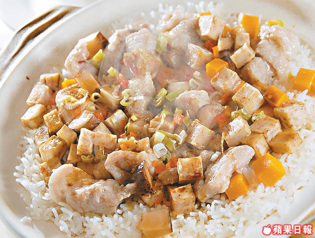 做法:先將米煲好至7成,香芋和南瓜洗淨、去皮、切粒後走油(不能以汆水代替,會令材料散至茸爛),再將已用鹽、生抽、生粉醃好的腩排放上面,焗20分鐘,配以混合好的生抽及老抽即可。