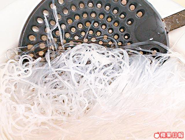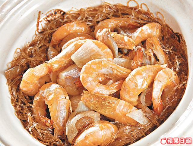 做法:先將粉絲用一半的上湯浸透,燒熱油至7成,中蝦撒上生粉,用猛火將生蝦炸熟。燒熱煲仔,加入牛油、亁葱及餘下的上湯一起煮滾,把粉絲及蝦放進煲裏即可。