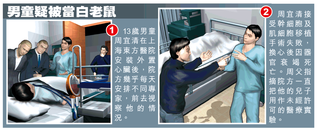 前年4月,13歲男童周宜清在上海兒科醫院被診斷為「原發擴張心肌病」。但當時前來會診的東方醫院,卻指周的病情嚴重,並聲稱可安排德國心臟專家替他先安裝外置人工心臟,讓他的心臟休息,之後再從骨髓抽取幹細胞,如撒種子般放在心臟上,修復心肌活力,成功率達90%。