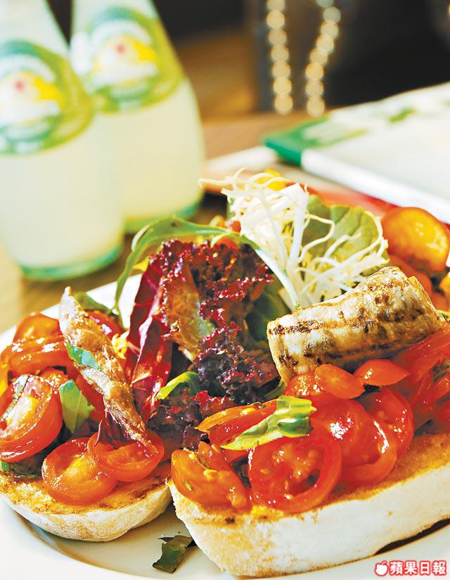 以烘焙的蒜茸包作底,面上鋪放鮮甜的意大利小番茄,再加香草、香葉及橄欖油,吃在嘴裏已一口鮮;此外三件包食中,仲各自放有意大利鹹魚、烤黃椒及烤茄瓜,鹹、香、辣、滑,變化風味萬千。
