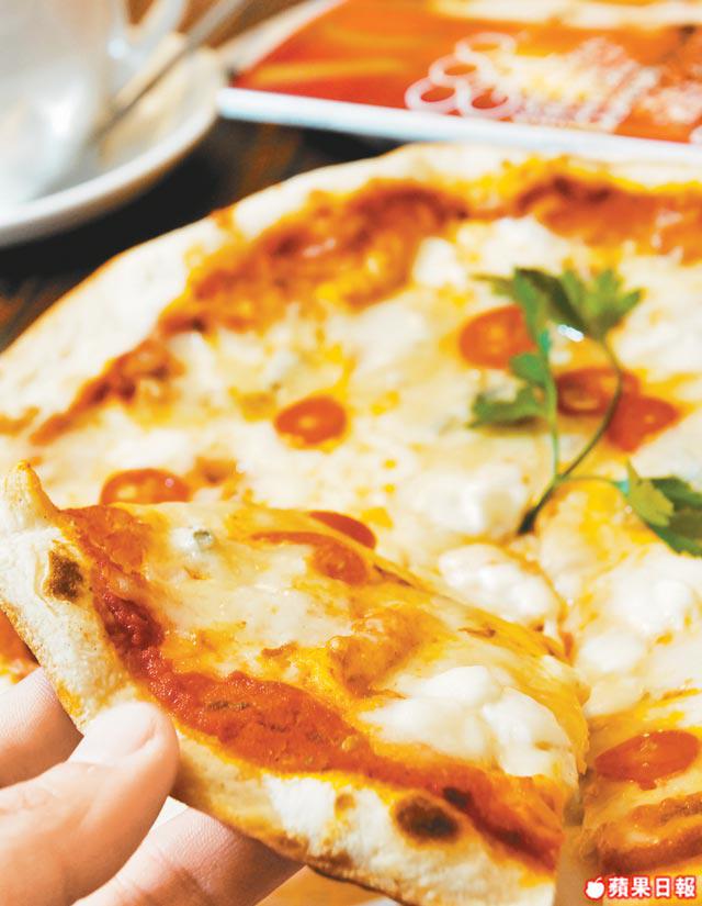 起用Provolone、BuffaloMozzarella、SmokedMozzarella、及Gorgonzola製成了純芝士風味薄餅,滙集了幼滑、粗獷、香氣及濃稠味道於一身,餅底只有2mm,入口脆到卜卜聲。