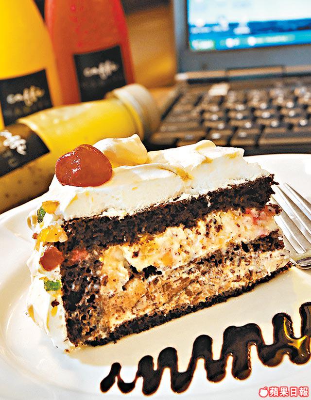 以朱古力海綿蛋糕夾雜意式亁果粒,意式風味出晒嚟!糕面、糕底分別熏上橙酒及杏脯酒,果香感更濃烈;糕面粗抹了一層微焦的蛋白、糖漿,感覺有如吃下一件藝術品。