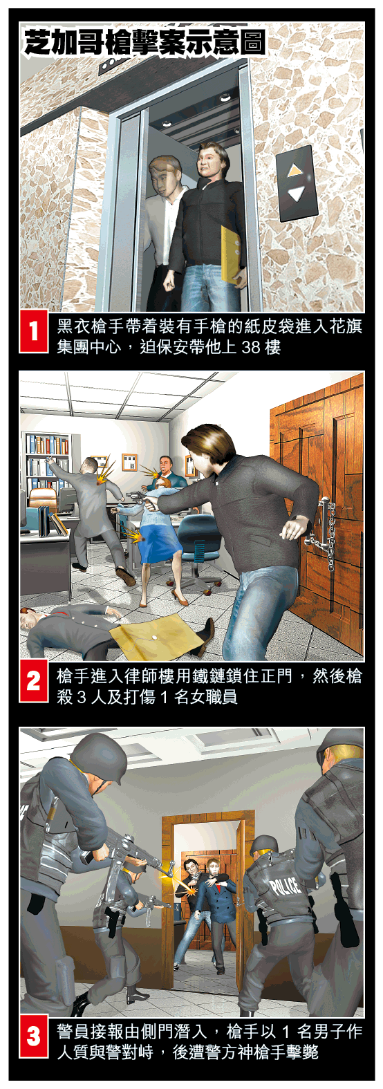 「我要找麥克納(MichaelR.McKenna)。」一名黑衣槍手,於美東時間上周五的下午,直闖入芝加哥的花旗集團中心(CitigroupCenter)38樓一間律師樓,兇神惡煞,點名要找麥克納律師,更用鐵鏈鎖上大門,把律師樓變成生死一線的「恐懼鬥室」,然後大開殺戒,射殺三人傷一人,最後特警趁他挾持一名人質時,在千鈞一髮的剎那,一槍把他了斷。警方相信,他是上門尋仇。