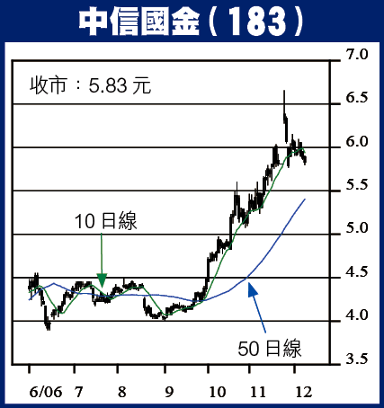 筆者相信,西班牙BBVA入股中信銀行及中信國金可加強雙方在兩地業務的合作,對改善中信銀行營運狀況有正面幫助。此外,當中信銀行日後來港上巿,便能反映出中信國金所持中信銀行的價值,屆時便有獲重新評估的機會。股價自消息公布後所見的高位6.65元已作了適當的調整,可考慮在5.8元附近吸納,中線目標6.5元,止蝕5.5元。