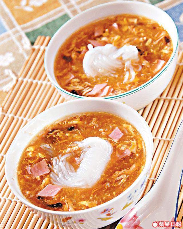 做法:把蠔油、粟粉、生粉、水、麻油、雞粉及鹽煮成蠔油芡,滾起後便加入手撕好的煲湯瘦肉、已浸軟切絲的冬菇、切粒火腿及芋絲,邊煮邊攪約5分鐘,盛起後加入適量胡椒及醋作調味即可。