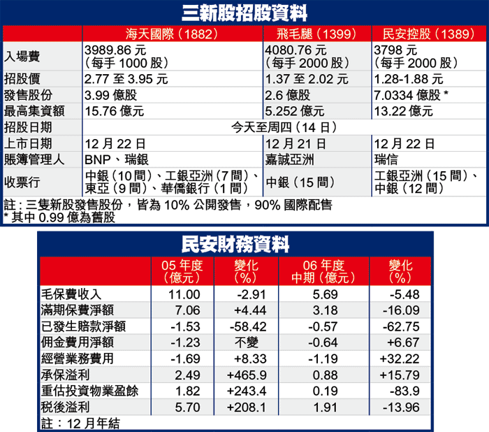 【本報訊】計劃大幅擴張內地非壽險業務的民安控股(1389),今天起招股,集團計劃全球發行7億多股,其中10%(約7003萬股)將售予香港公眾(包括700萬股供僱員優先認購),每股招股價介乎1.28元至1.88元,預測市盈率14.2至20.9倍,未計超額配股權,將最多集資13.22億元。由於承保溢利減少及香港樓市今年增長緩慢,民安預期今年稅後溢利不少於2.54億元,比較05年大減55.4%。