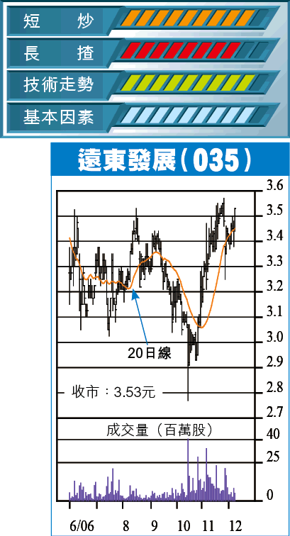 遠東發展(035)市值50億元,旗下兩大業務,內地地產業同本港酒店業,未來幾年肯定可以提供豐厚收益,以每年盈利估約6億元計,預測PE只係8倍多,同同類股比較,股價實在大落後。