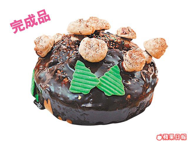 把朱古力及忌廉放入碗中,以熱水坐溶,然後唧在蛋糕面,並鋪上聖誕樹、蘑菇等作點綴。