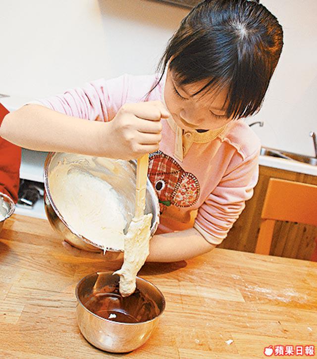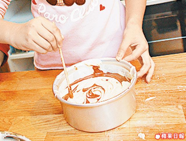 將約1/4已攪好的材料倒入朱古力漿中,攪勻成A材料。