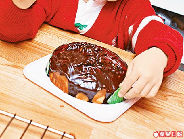 今日教大家炮製朱古力雲石蛋糕,面層鋪滿了朱古力醬,加上聖誕樹和蛋白蘑菇,樣子精緻,西瓜波看見後也不捨得吃進肚裏。不過這蛋糕的製法較複雜,還需要使用電打蛋器及焗爐,所以製作時必須由成人陪同。