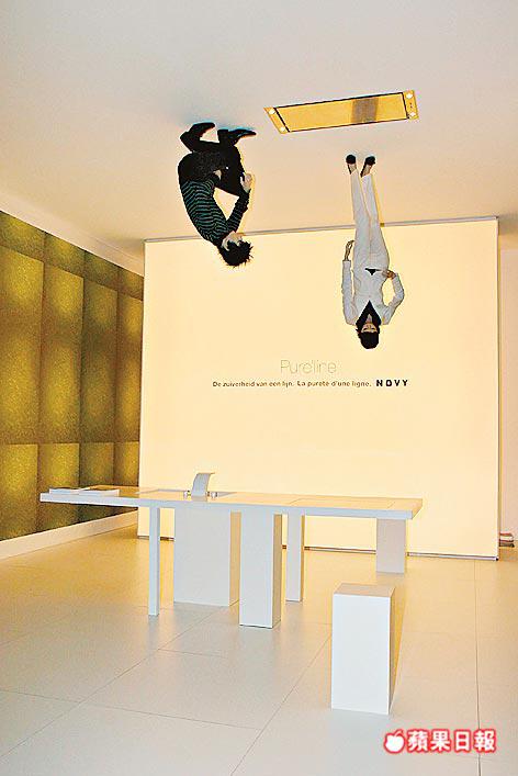 設置假人在天花板,原來是為推銷抽油煙機。製造商Novy研製的Pure'line抽油煙機可藏於天花板內,以遙控掣啓動操作,隔油層可拆出清潔,售萬多元。