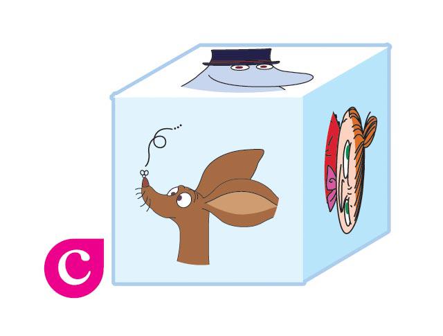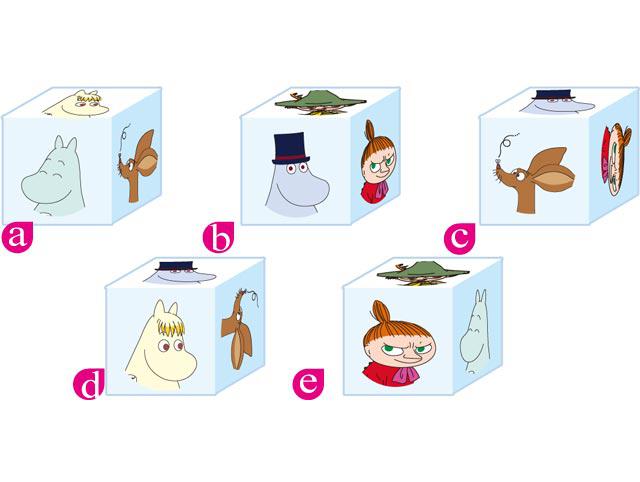 充滿鬼主意的亞美,自製了一顆小骰子,骰面貼了姆明谷的主角,你能從a至e中找出哪顆才是亞美製作的骰子嗎?