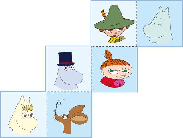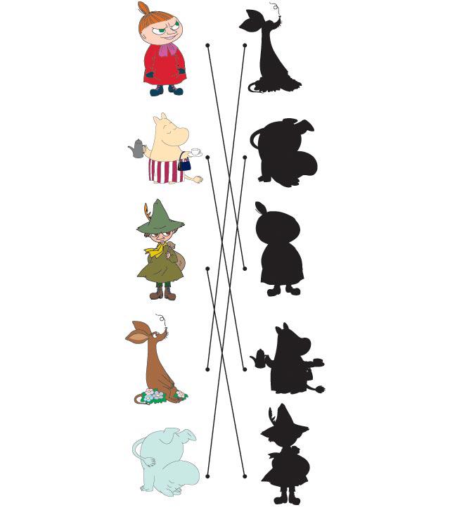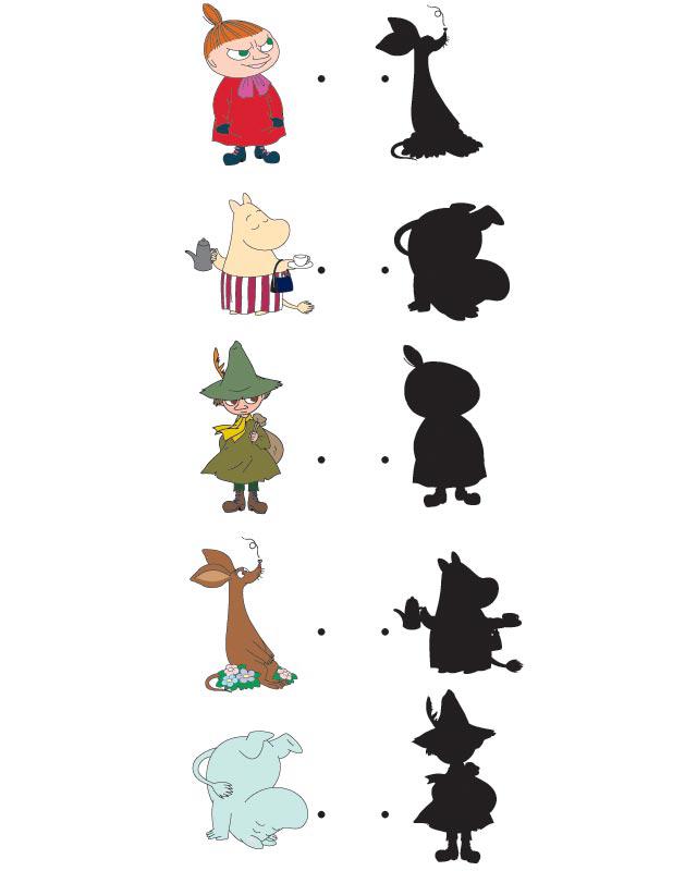 歌妮哥哥遺失了眼鏡,現在他眼前模糊一片,只看到姆明等人的身影,你能為歌妮哥哥把他們與影子連在一起嗎?