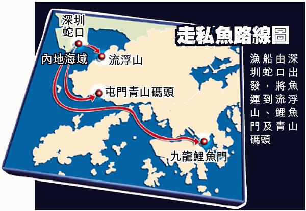 該業內人士指,本港最少有五成淡水魚屬走私,較政府所指的三分之一更多,尤其是近期淡水魚供不應求,本地魚價格上升,走私魚更氾濫。走私漁船一般從深圳蛇口開出,直接駛往流浮山、鯉魚門及青山碼頭,將魚穫上岸,因本地沒法例規管走私魚,漁船駛入本港海域公然上岸。流浮山批發市場一向賣鹹水魚,但日前食環署公布有鹹水魚含禁藥後,流浮山批發市場隨即轉賣走私淡水魚。有不法商人甚至直接將魚穫運往食肆及零售檔,再向市民佯稱是本地魚。