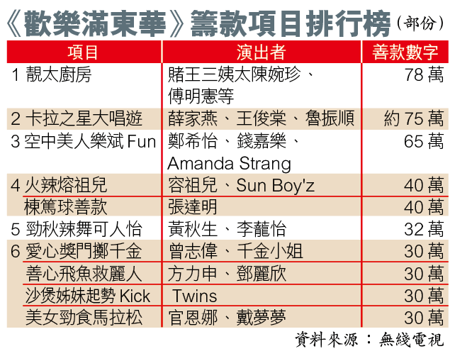 鄭希怡前晚在「空中美人『樂』『斌』Fun」環節中甩褲露T-back,全城哄動,籌得65萬排第三;無綫播映已故慈善伶王新馬師曾獻唱《萬惡淫為首》片段,有善長捐25萬支持;汪明荃的fans用銀紙摺成的銀紙船,則以15.3萬成功拍賣。