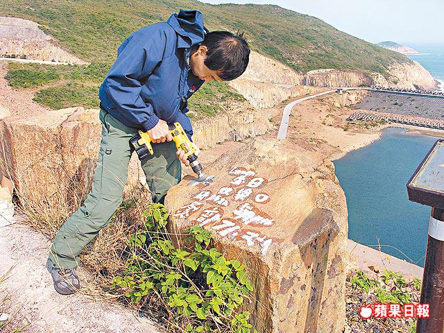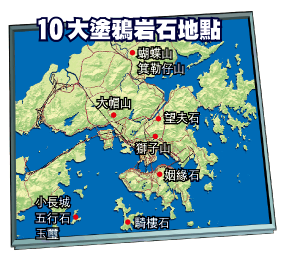 【本報訊】定情、咒罵、作畫、題詩……塗鴉令岩石尊嚴掃地,但缺德者卻樂此不疲。行山人士選出10大塗鴉最嚴重的岩石,癡男怨女的拍拖熱點「望夫石」與「姻緣石」位列冠、亞軍。有專家指出塗鴉的年輕人日增,有些每逢重遊舊地都會補上幾筆,讓大作「歷久常新」;有些甚至使用強力油漆,義工隊極力打磨清理也是徒然。漁農自然護理署表示,檢舉塗鴉者異常困難,過去只曾成功檢控一人。 記者:白琳