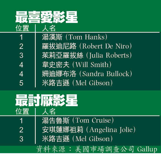 平日最多新聞的明星,原來未必最受觀眾歡迎。近日美國一個最富吸引力的影星調查選舉(Mostappealingmoviestars)中,經常成為頭條人物的湯告魯斯(TomCruise)及安琪蓮娜祖莉(AngelinaJolie)不但大熱倒灶,更成為最犯眾憎的影星,反而實力非凡的影帝級人馬湯漢斯(TomHanks)及羅拔廸尼路(RobertDeNiro),卻深得影迷歡心,成為影迷最想入場欣賞的明星。