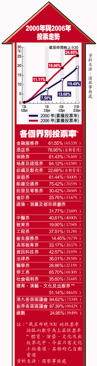 迄昨晚九時半整體投票率達24.95%,已較上次2000年投票率增加了5.46%,當中以兩個區議會投票率最高,超越80%投票率,另外酒店、航運交通界投票率也逾70%。