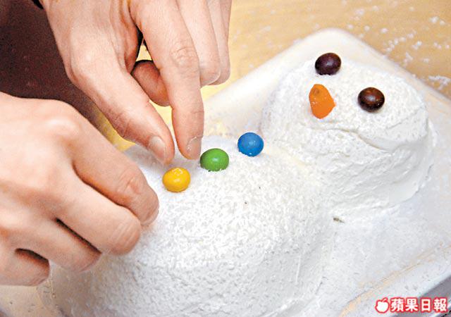 Step4︰糖膏搓成鼻子,朱古力豆作眼睛,及圍出絲帶形作頸部裝飾,最後在凍餅旁撒上朱古力米即可。