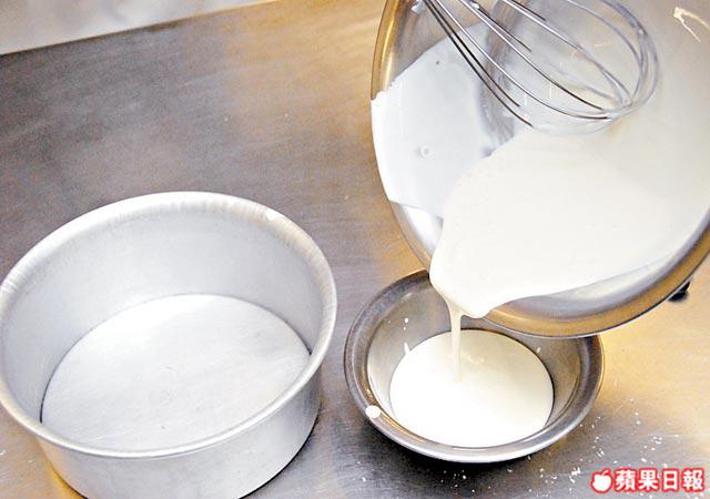 Step2︰淡忌廉打至軟滑時加入魚膠粉拌勻,然後放入椰漿、鮮奶及砂糖混和,分別倒入2個圓形兜中,放入冰格雪至凝固。
