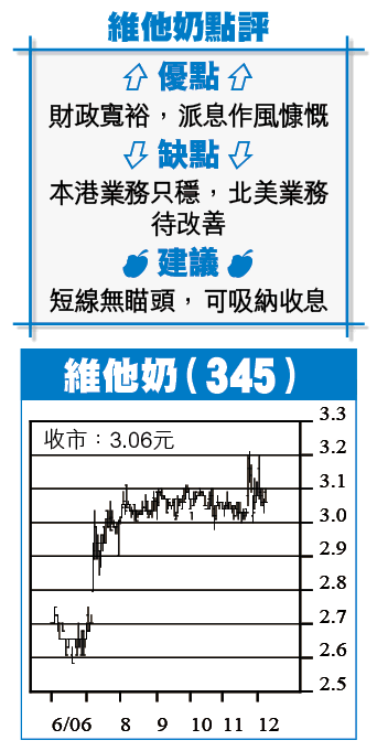 維他奶現價3.06元,預期PE16.3倍,息率(包括特別股息)6.37厘,可作收息用途。