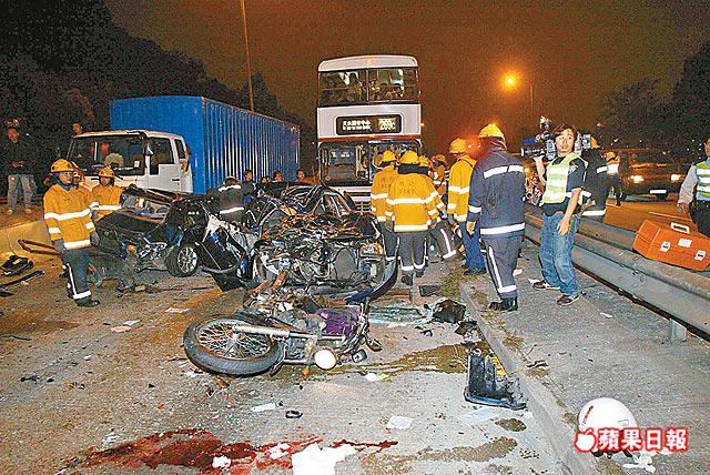 【本報訊】石硤尾呈祥道與大埔道交界處,昨晚發生五車連環相撞嚴重車禍,一輛私家車失控越線猛撞一輛電單車後,被撞電單車反彈撞向後面一輛私家車,尾隨一輛貨車及巴士收掣不及相撞一起,意外中年逾六旬電單車鐵騎士、肇事私家車司機及被撞私家車上4名男女受傷,分別送往明愛醫院及瑪嘉烈醫院救治,其中鐵騎士傷重垂危。