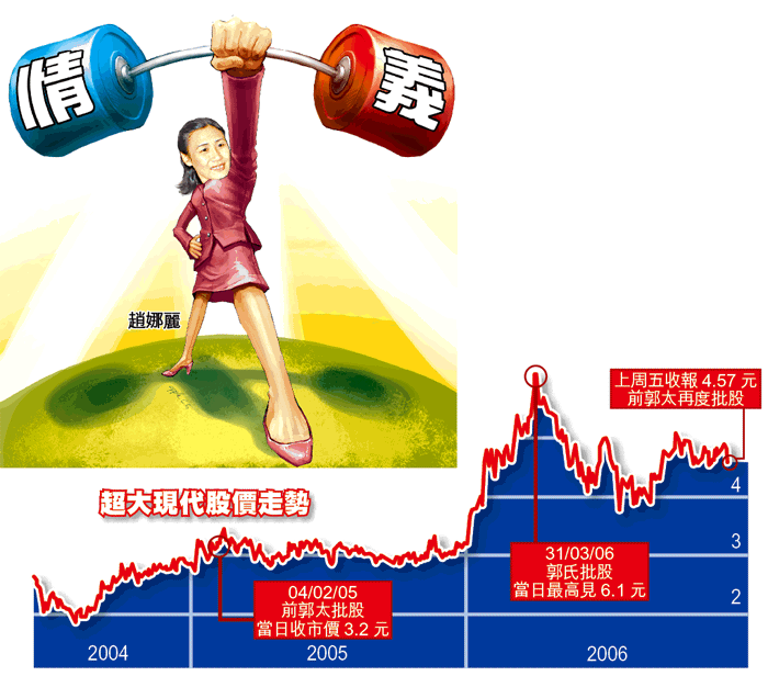 最令華華出奇嘅,係趙娜麗女士原來已經變成前郭太,唔怪得早喺04年9月,前郭太突然以大陸最流行嘅「健康」做理由,辭鬼咗個董事職位啦。又唔怪得舊年2月4號嘅時候,佢突然同郭浩分開申報喺超大嘅持股量,當時,市場曾以為郭浩想批股而事先作出安排,原來係……