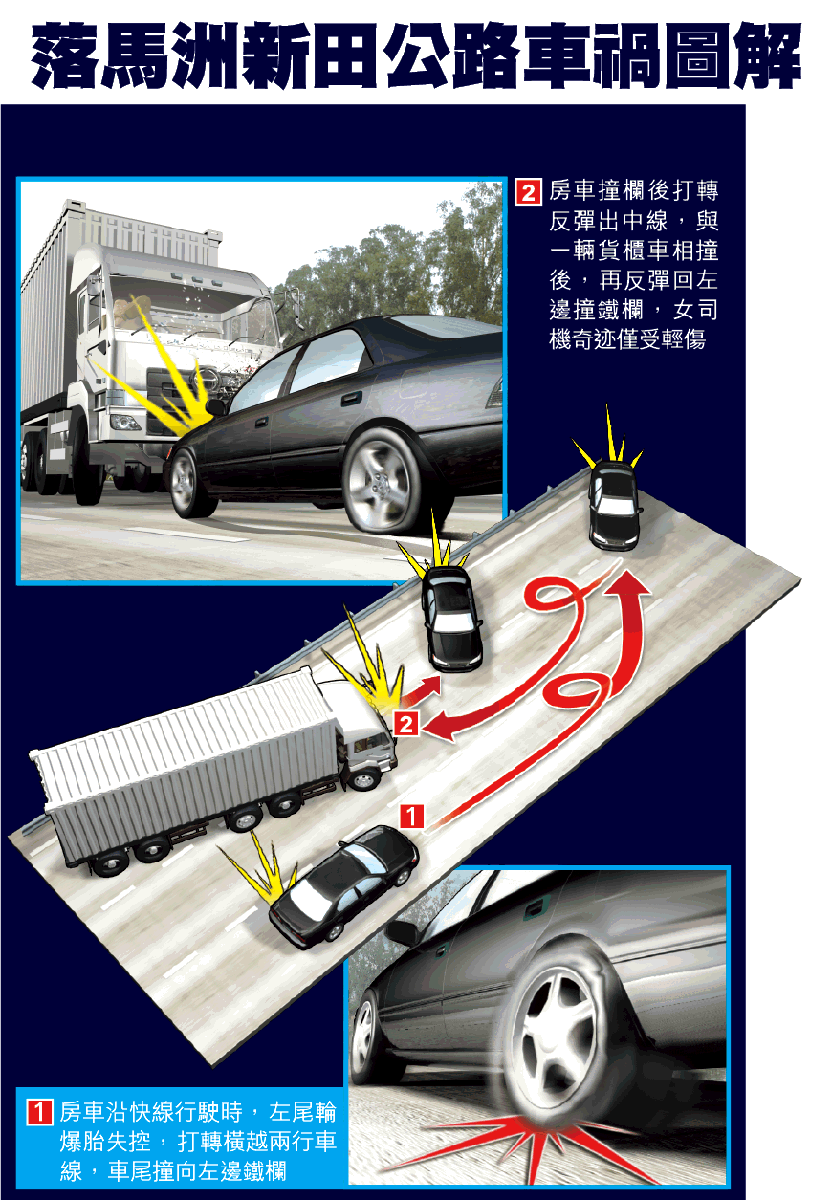 昨晨8時許,梁婦駕車往元朗娘家接父親出外飲茶。其間房車沿新田公路駛越落馬洲交滙處不久,女司機事後聲稱因左尾輪突然爆胎,致失控打「白鴿轉」由快線越過兩條行車線,車尾撞向慢線左邊鐵欄後仍餘勢未了,繼而恍如「波子機」飛彈回右邊路面,在中線與一輛因閃避意外由慢線切出的貨櫃車相撞,房車再打轉反彈回左邊撼向鐵欄。