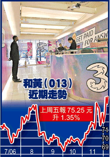【本報訊】英國星期日FinancialMail引述消息人士指出,和記黃埔(013)御用證券行高盛,正為3英國尋找潛在買家,放售價達60億英鎊(約918.1億港元)。今年11月獲提升為高盛合夥人的SimonHolden,曾與TMobile、O2及其他電訊營運商接觸,並舉行會議,其中中國移動(941)更有興趣購入和黃整項3G業務。Holden為高盛駐倫敦的投資銀行家,擅長於電訊及媒體的收購合併。