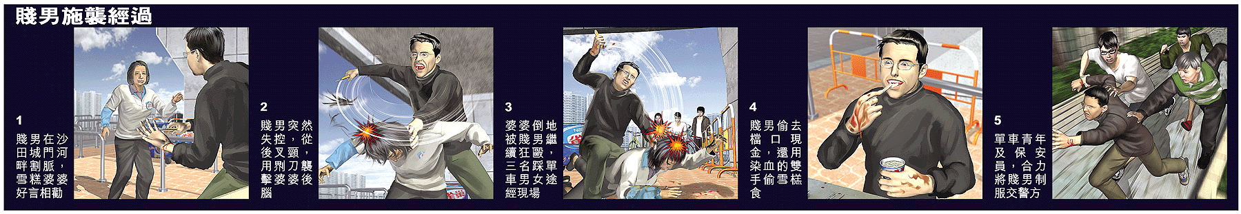 【本報訊】一名「賤男」以為失戀「大晒」,昨在沙田源禾路單車徑割脈自殺,被附近賣雪糕的婆婆勸止,他竟然「發爛渣」用𠝹刀向婆婆施襲,並毒打她三分鐘,搶去檔口170元、雪糕及飲料,然後肆無忌憚食雪糕。全程有三名踏單車青少年目睹,但他們以為是電視台拍搞笑節目,幸有保安員出手制止賤男,合力把他制服交給警方。遇襲雪糕婆婆頭部受創,送院搶救一度危殆。 記者:文兆麟 梁瑞帆 李偉民
