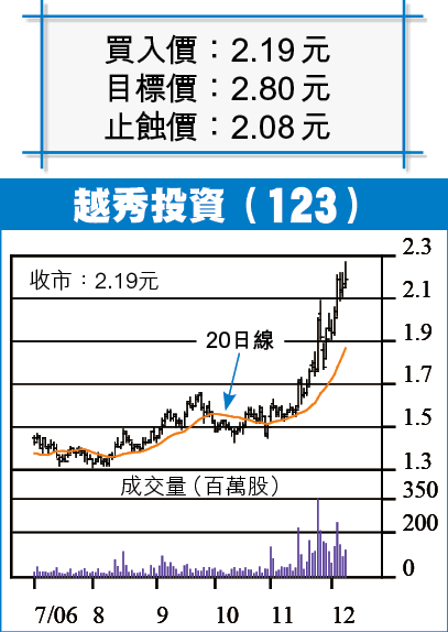 越秀投資(123)上日報收2.19元,升1.86%,股價於11月中打破橫行狀態,並一浪高於一浪發展,上日升至2.24元隨大市回落現即市調整,成交增加的「陀螺」走勢顯示升勢有餘未盡,9RSI及MACD仍甚強勢,相信突破2.30元後,會開展另一輪急速上升,向2.60至2.80元推進,現價買入,以2.08元作止蝕位,突破2.30元,可加1注。今早要特別留意成交變化,若上午之成交已達上日之2/3,則在股價升越2.24元已可偷步加注。