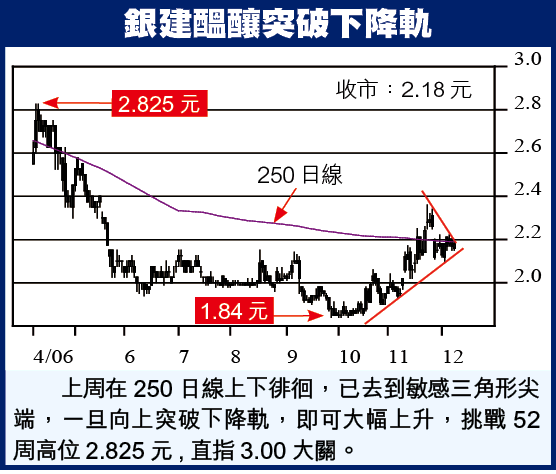 FollowMe8月27日推介銀建,亦係正選,推介前1.98元,11月23日升至2.36元,累升19%。其後回至2.10元見底回穩,一旦突破敏感三角形下降軌,即可重納升軌,但今次2.50元非阻力所在,值得跟進,睇好理由如下:
