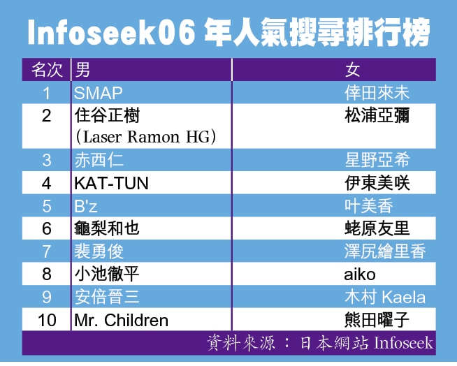 日本搜尋網站Infoseek日前公布「2006年人氣搜尋排行榜」,松浦亞彌成女性名人榜的亞軍,僅以些微之差敗給女歌手倖田來未。其餘第三至第五名分別為水着女星星野亞希、伊東美咲和富婆叶美香,日劇《一公升眼淚》女主角澤尻繪里香則排名第七。