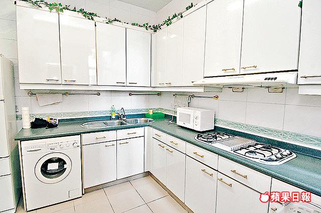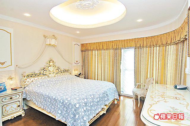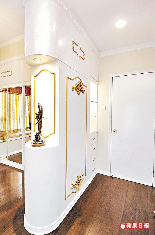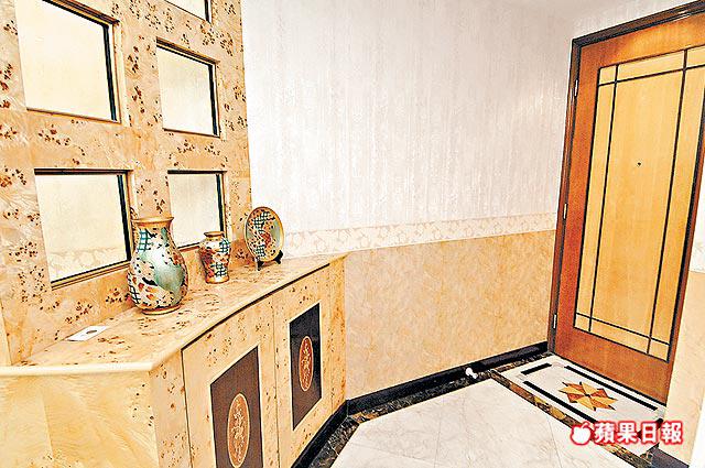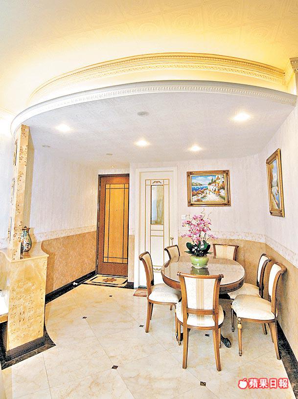 單位落本裝修,客飯廳鋪雲石地板,建半圓形假天花燈槽,訂做大櫃及地櫃。兩房訂做入牆家具,書房以深色為主,套房以宮廷式設計,配以雕花及金漆效果,效果華麗悅目。