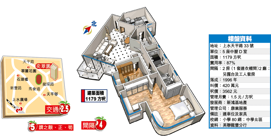 上水東鐵站人潮不絕,周邊大廈林立,環境十分熱鬧。靠近天平山村的奕翠園,環境截然不同,外圍樹木簇擁,內園碧綠青翠,享大自然秀氣。單位普遍1000方呎以上,為區內罕有以大單位為主的屋苑,住者非富則貴,不少更是經常北上做生意的商家。