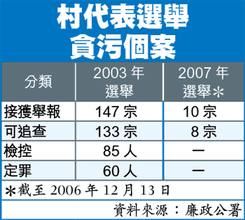 廉署選舉事務統籌張愛倫昨接受訪問時表示,廉署於2003年村代表選舉中,共接獲147宗貪污舉報,檢控85人,結果有60人被成功定罪,定罪率達70.5%,刑罰由社會服務令至監禁三個月不等。
