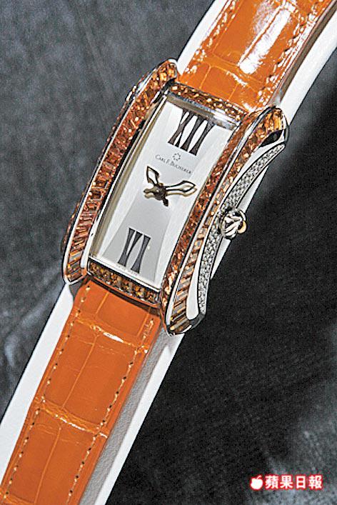 今次由名模樂基兒示範、擁有80多年悠久歷史的鐘錶品牌CarlF.Bucherer(寶齊萊)的全新AlacriaDiva18K白金限量版腕錶。新錶分別鑲嵌了罕有炫目的藍寶石和橙色鑽石,蘊含迷人的古印度異國風情,全球僅限量發行25隻,成為珍品中的珍品,極具收藏價值。