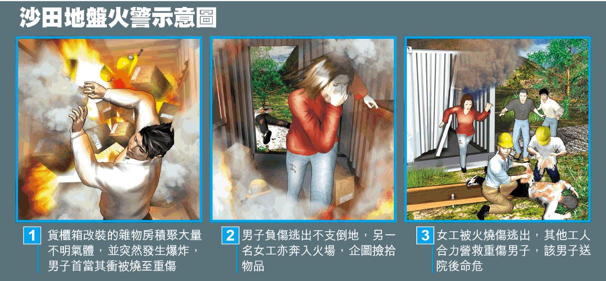 現場為沙田水泉坳街對開一個土木拓展署的道路工程地盤,地盤內放有兩個相連的20呎長貨櫃箱,一個用作寫字樓,一個則是改裝的雜物房,用以擺放工具和建築物料。昨上午11時15分,在貨櫃寫字樓內兩男女職員,突然聽到一聲巨響,大驚下立即奔出查看,發現相連的貨櫃雜物房正冒煙起火。